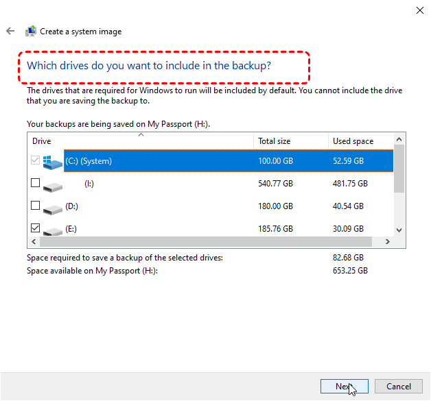 Step 5. Select the drives you want to include in the image (by default, it includes the system drive, C:).