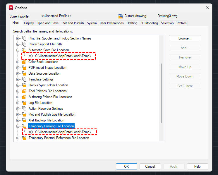 - Local temp directory — AutoCAD often writes autosave files to the Windows Temp folder (e.g., C:\Users\yourusername\AppData\Local\Temp).