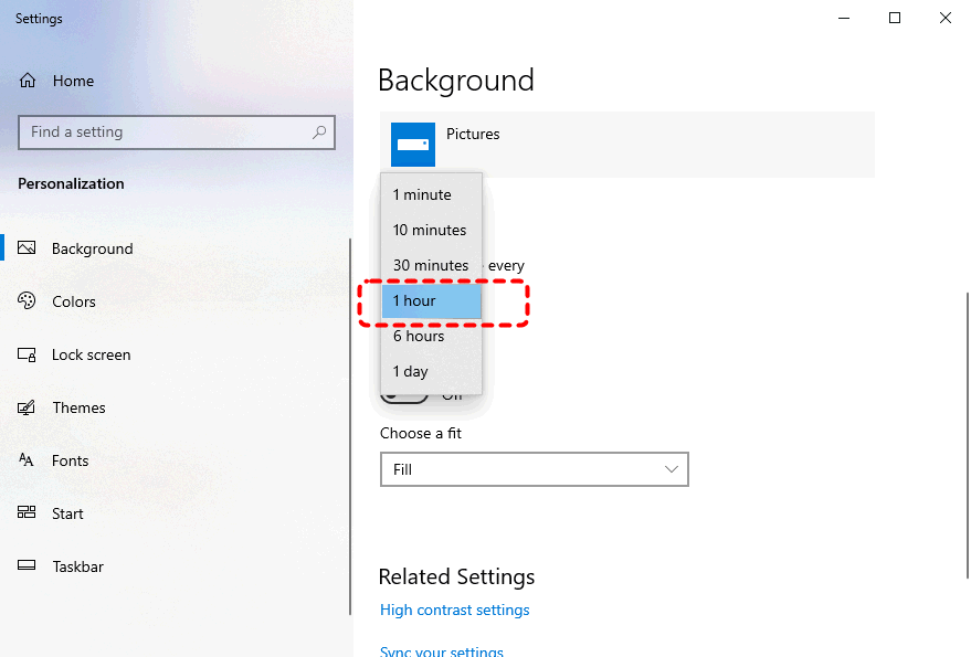 Step 3. If you want to keep the wallpaper slideshow, it’s best to lengthen the slideshow switching interval. Scroll down to the "Change picture every" option and select "1 hour" or a longer time period.