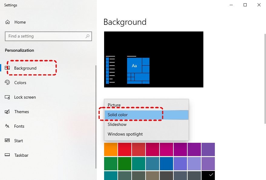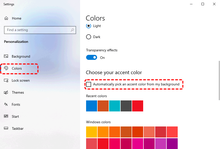 Step 2. Locate the "Colors" section, scroll down and uncheck the "Automatically pick an accent color from my background".