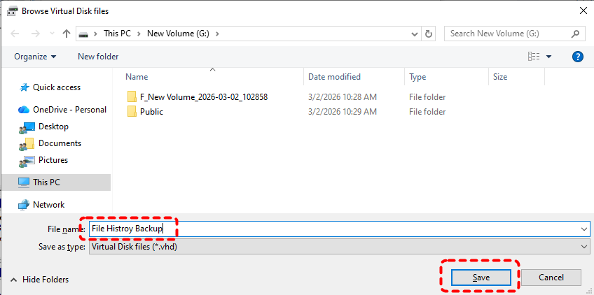 If Windows continues rejecting the physical internal drive, creating a VHD provides logical isolation that File History accepts more reliably. Although the VHD file is stored on your internal backup drive, Windows will recognize it as a separate external/removable disk device when mounted.