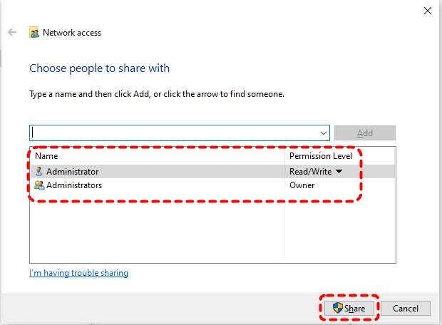 Step 4. Set the folder sharing permission in the drop menu and click "Share". Then, check and note the network path (e.g., \\PCName\Backup) of the folder under the "Share" tab.