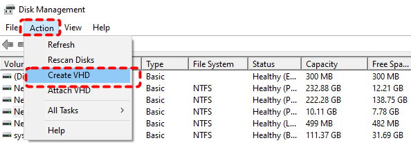 Step 2. Click "Action" on the top menu and choose "Create VHD".