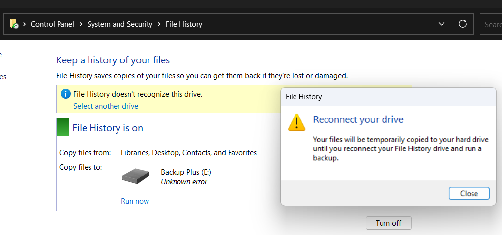 In most cases, the issue is not that the drive has disappeared from Windows, but that File History can no longer properly validate or access the internal disk. Once the drive becomes full, develops file system inconsistencies, or is flagged by File History’s safety rules, Windows may treat it as unavailable and stop backup operations.