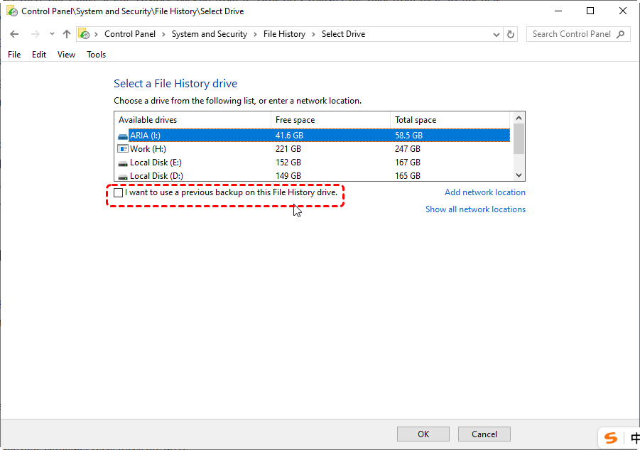 Step 4: Browse and select the drive containing your old computer’s File History. Check the box next to "I Want To Use A Previous Backup On This File History Drive".