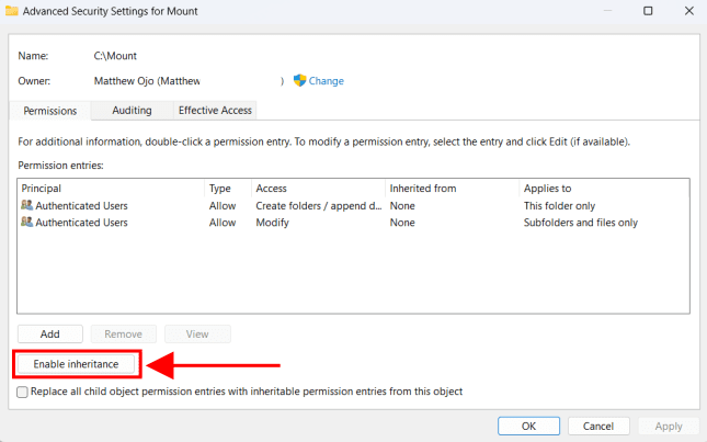 2. Click Advanced. Then click Enable Inheritance.