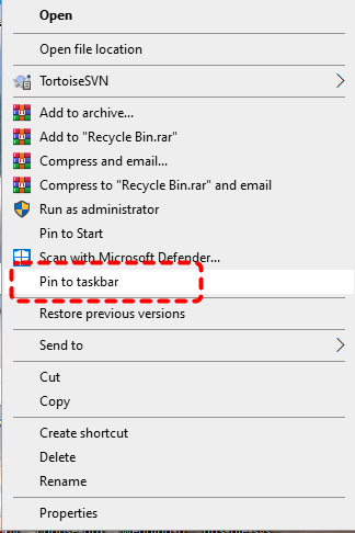 Right click on the new Shortcut you created on desktop and select "Pin to taskbar". Now, your Recycle Bin will be pinned to your Taskbar for easy access.