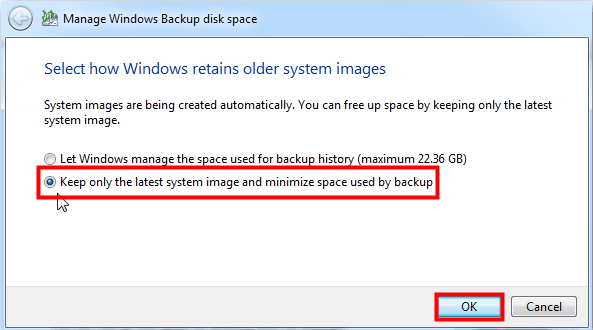 If you choose the option "Keep only the latest system image and minimize space used by backup", Windows will retain your most recent system image while deleting older ones automatically.