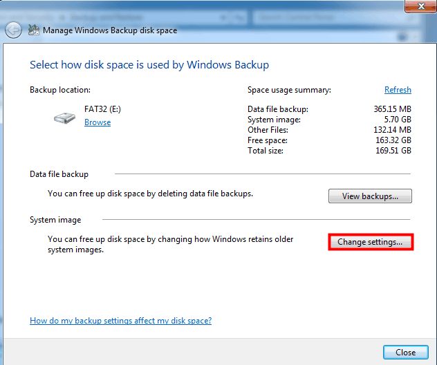 In the "Manage Windows Backup disk space"window, click "Change settings" in "System Image" section.