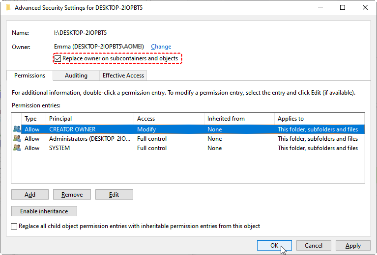 Step 5: Check "Replace owner on subcontainers and objects". Click "Apply" and "OK" to save changes.
