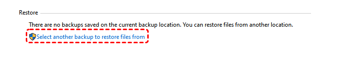 If the backup folder was moved or renamed and Windows says "There are no backups saved on the current backup location", either restore it to the original location or use "Select another backup to restore files from" in Backup and Restore.