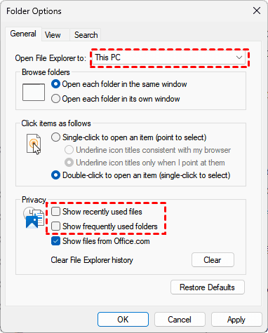 2. In the General tab, change "Open File Explorer to:" to This PC.