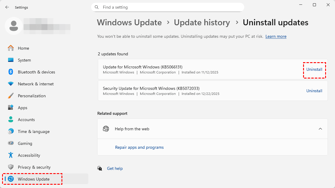 Way 13. Uninstall Recent Windows Updates