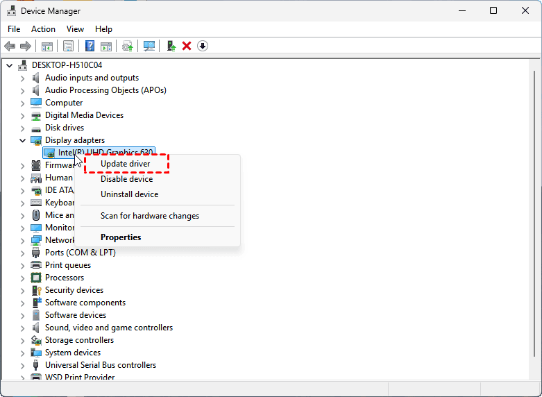 2. Right-click your graphics card and choose Update driver.