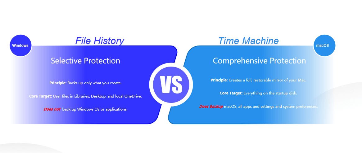 Compare Windows File History and Mac's Time Machine for data backup. Understand the key difference: File History protects your personal documents with versioning, while Time Machine creates complete system backups for full disaster recovery. Discover which tool is right for your needs.