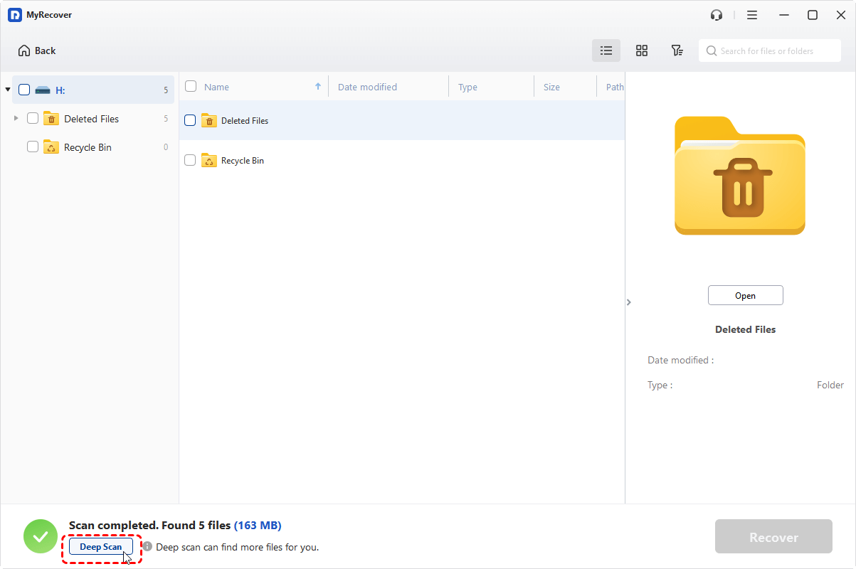 Step 3: MyRecover will automatically initiate aquick or deep scan based on the "recovery scenario" you select in the left pane before clicking "Scan" button. If a Quick Scan is started first, you can manually switch to a "Deep Scan" to thoroughly search for recoverable data.