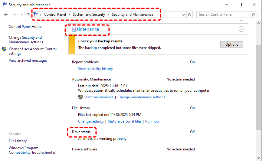 Sometimes, Windows might have additional security-related or system maintenance issues. Checking the Security and Maintenance tab might help you to identify hardware or software issues.