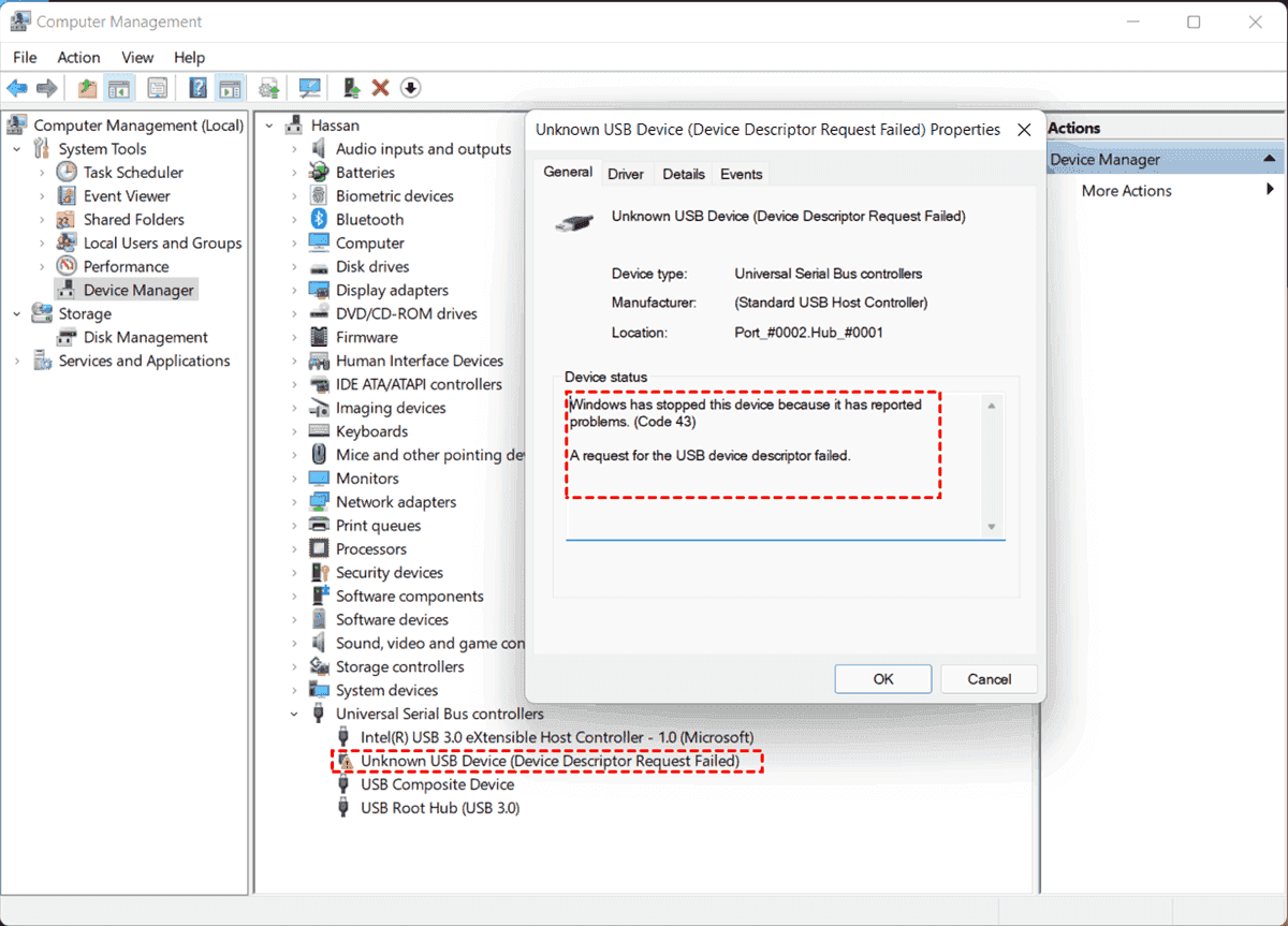 It's common to see the error message "Windows has stopped this device because it has reported problems. (Code 43). A request for the USB device descriptor failed.", and the USB drive will show Unknown USB Device (Device Descriptor Request Failed) in Device Manager. It cuts you off from essential gadgets—external drives brimming with memories, peripherals you need for work, or even internal components.