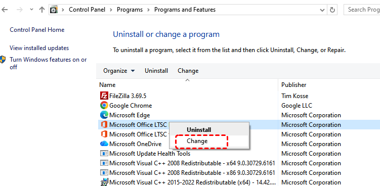 Step 2. Locate "Microsoft Office" and right click on it, then choose "Change".