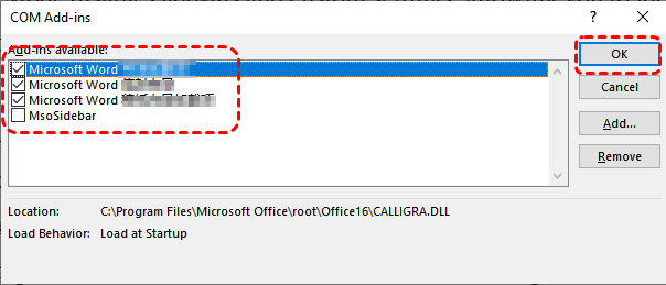 Step 5. Uncheck the suspicious Add-ins and click "OK" to save the changes.