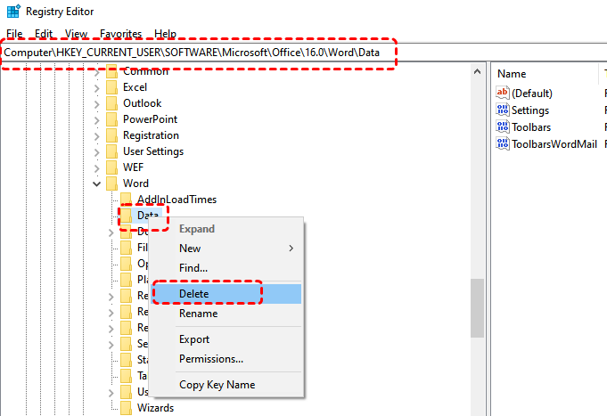 Method 6. Delete Word Data Registry Subkey