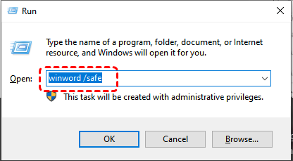 Step 1. Press "Win" + "R" to open the Run dialog box, then type "winword /safe" and press "Enter".