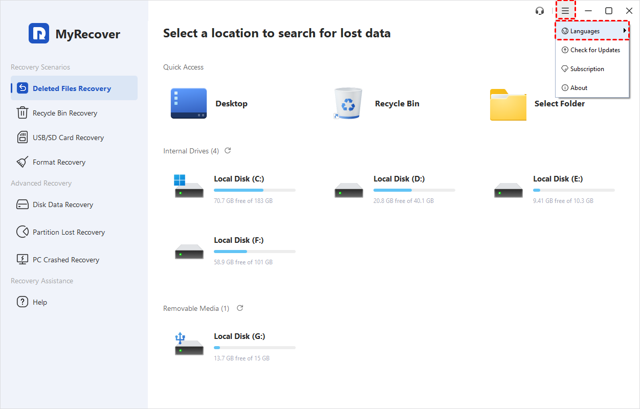Currently, MyRecover supports multiple languages, including English, German, French, Japanese, Spanish, Italian, and Traditional Chinese. Here are the steps to change language.